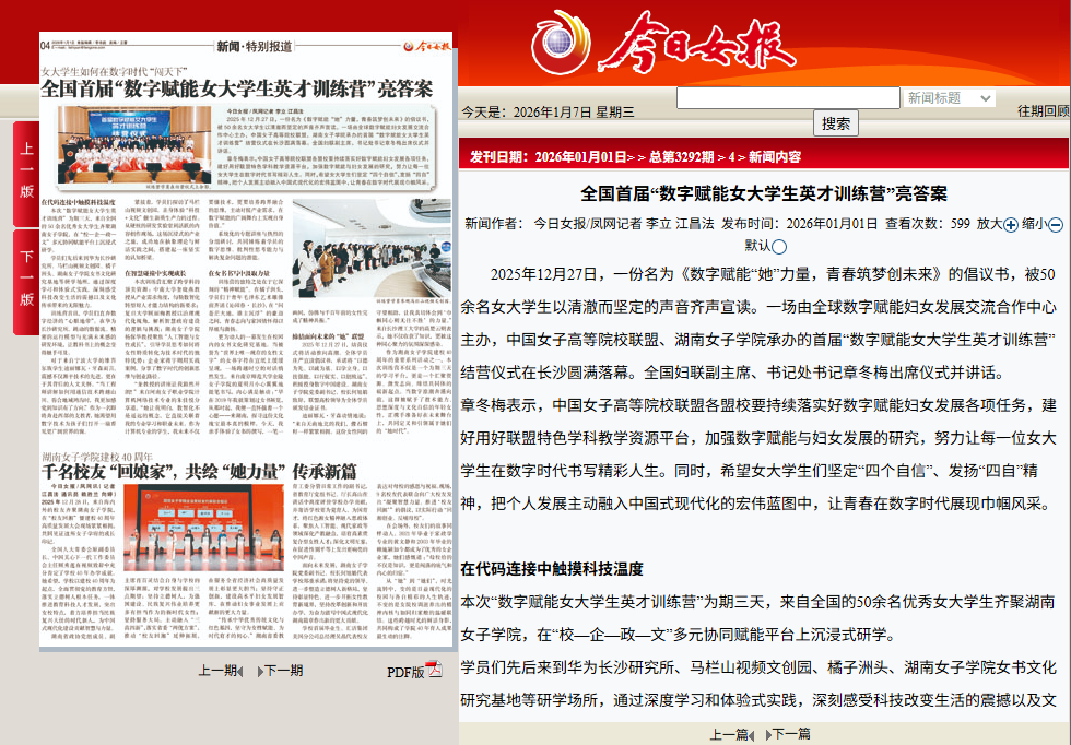 【建校40周年】今日女报|全国首届“数字赋能女大学生英才训练营”亮答案 日期:2026-01-02 15:09:03 (链接地址:http://jrnb.fengone.com/new/Html/2026-01-01/26095.html)